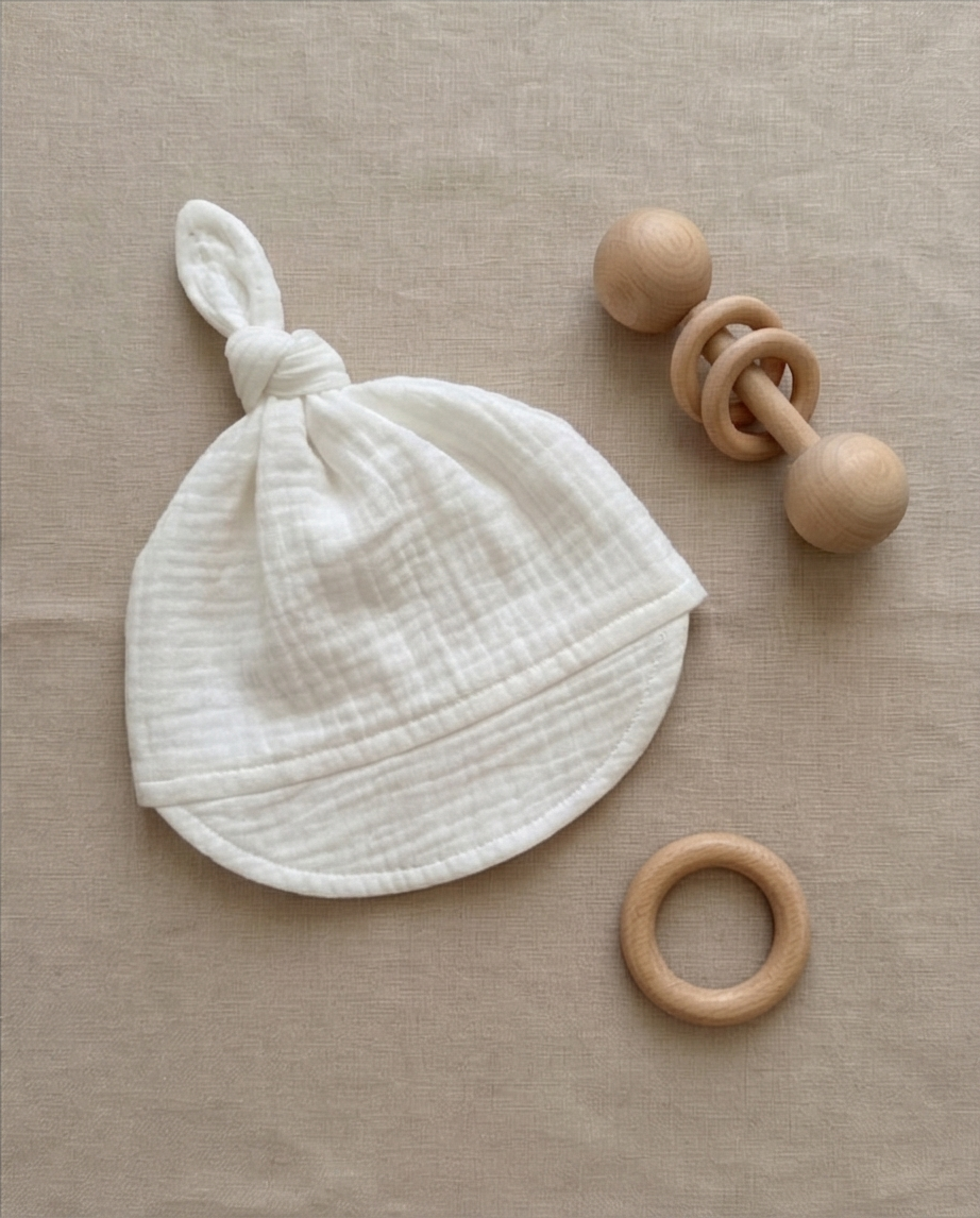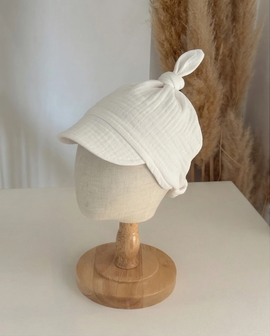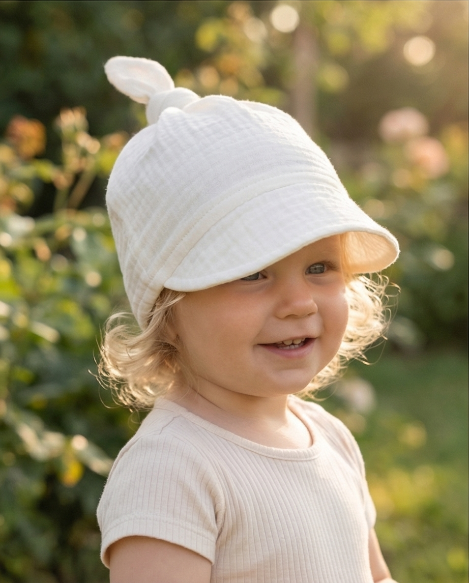 Uszyta z miękkiego, oddychającego muślinu, który świetnie sprawdza się w cieplejsze dni – chroni główkę przed słońcem, jednocześnie pozwalając skórze oddychać. Lekki daszek osłania oczy przed promieniami, a luźny krój zapewnia komfort noszenia i swobodę ruchów.