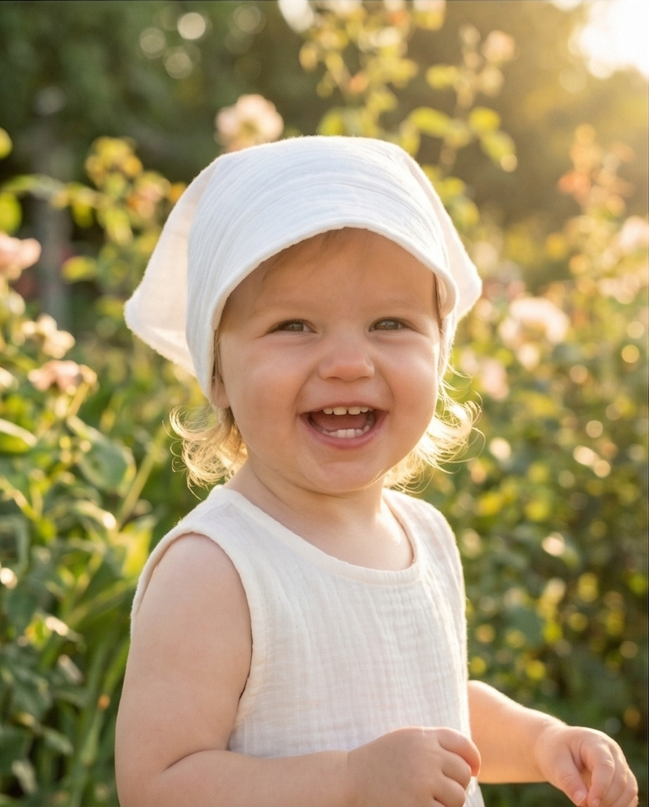 Delikatna i niezwykle przewiewna chustka muślinowa stworzona z myślą o najmłodszych. Idealna dla dzieci od około 6 miesięcy do 5 lat – rośnie razem z dzieckiem dzięki wygodnej gumeczce z tyłu, która zapewnia dobre dopasowanie bez ucisku.