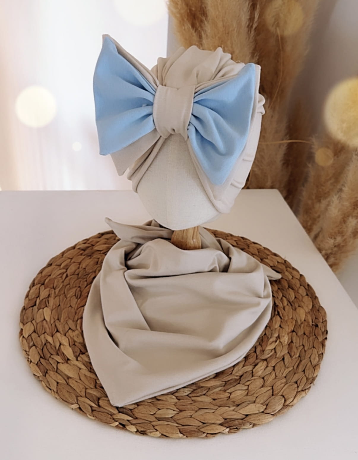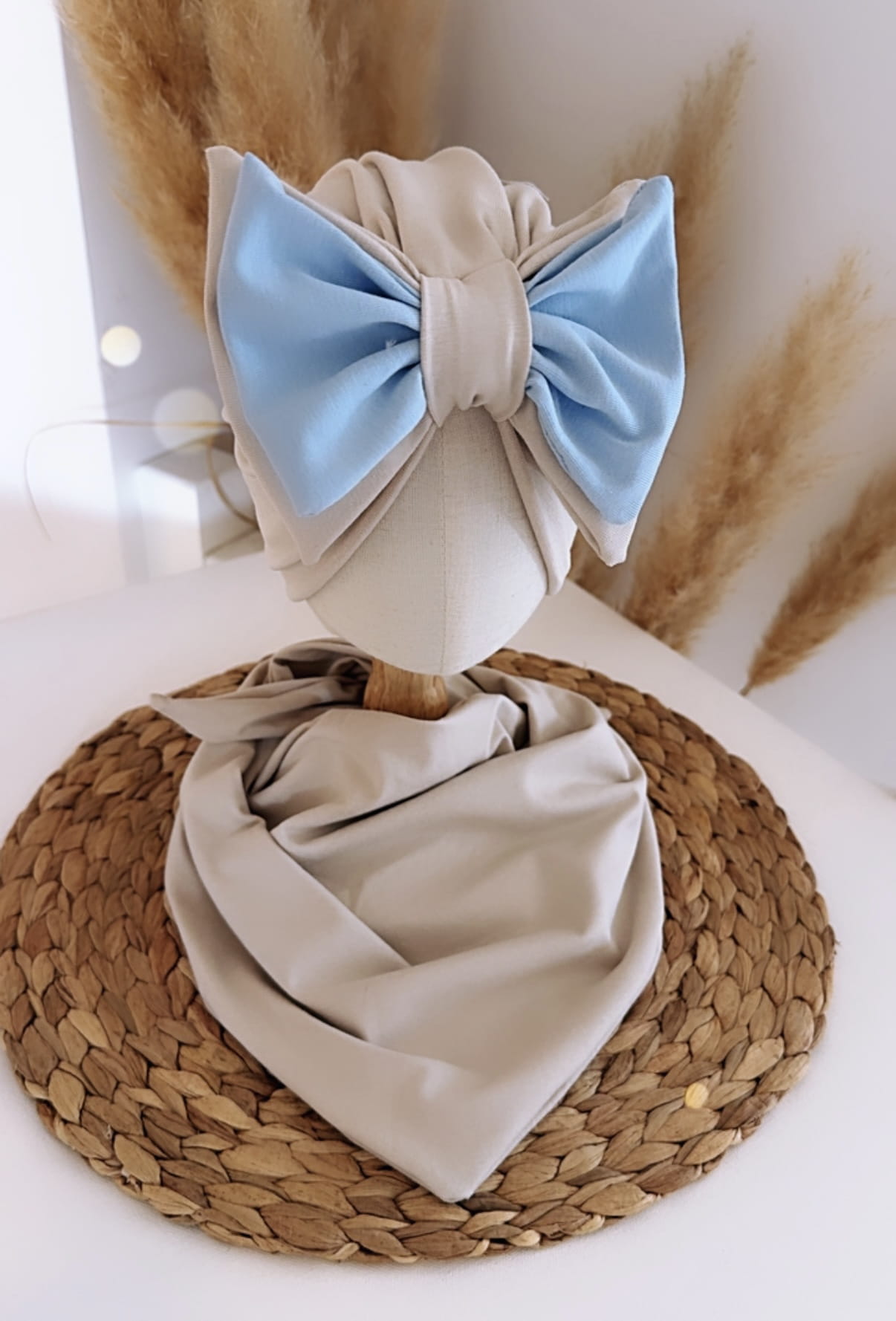 Turban ozdobiony efektowną kokardą przyciąga uwagę i nadaje całości wyjątkowego, eleganckiego charakteru. Chusta idealnie dopełnia zestaw, tworząc spójną i stylową kompozycję.