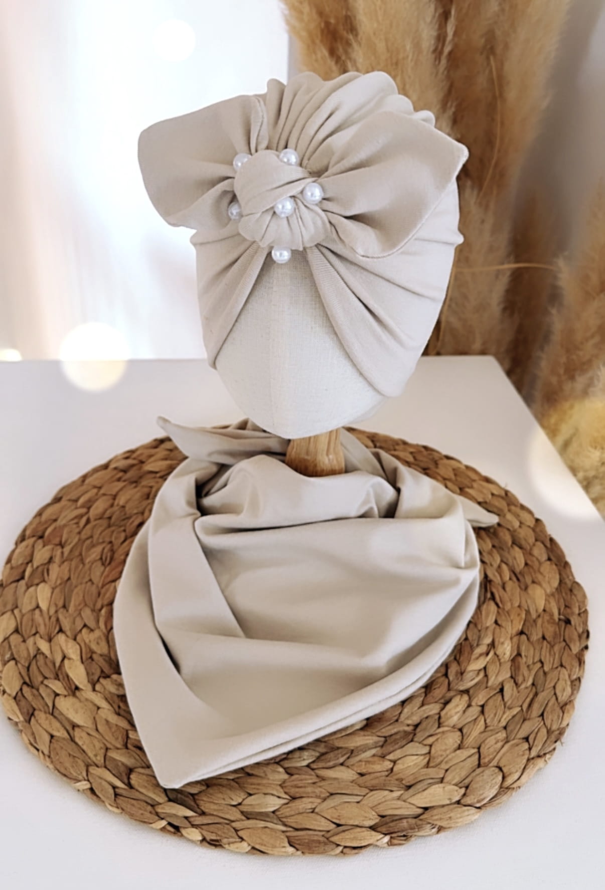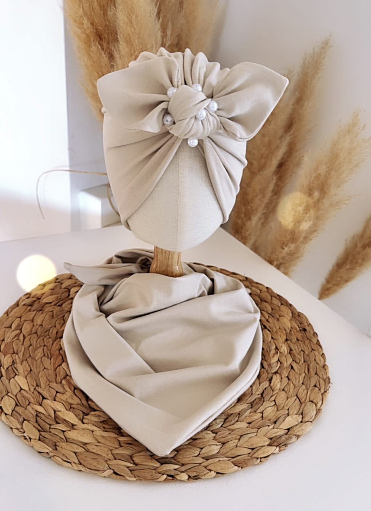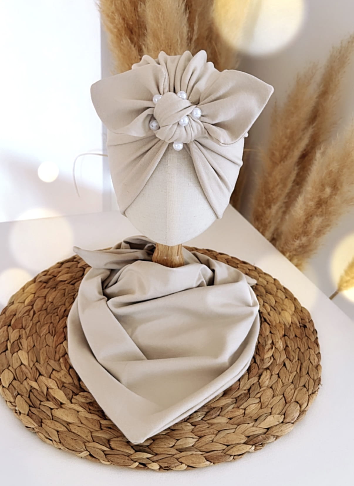 Turban ozdobiony efektowną kokardą z subtelnymi perełkami przyciąga uwagę i nadaje całości wyjątkowego, eleganckiego charakteru. Chusta idealnie dopełnia zestaw, tworząc spójną i stylową kompozycję.