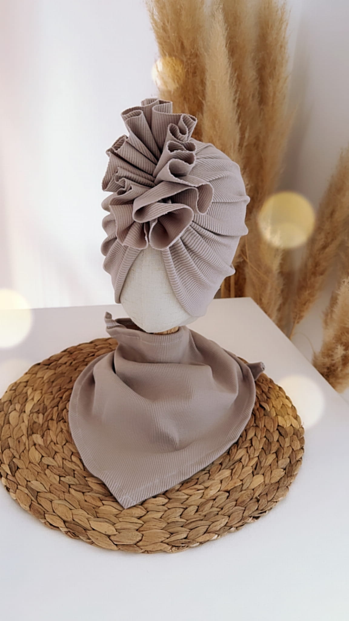 Komplet prążkowany turban z falbaną i chusta (sandy)