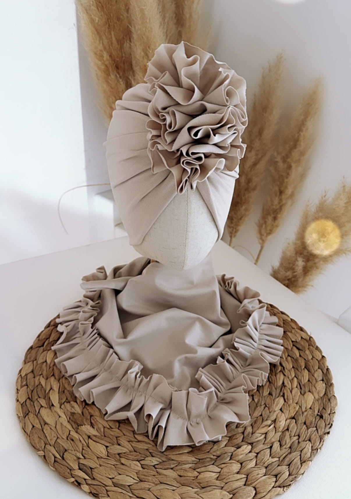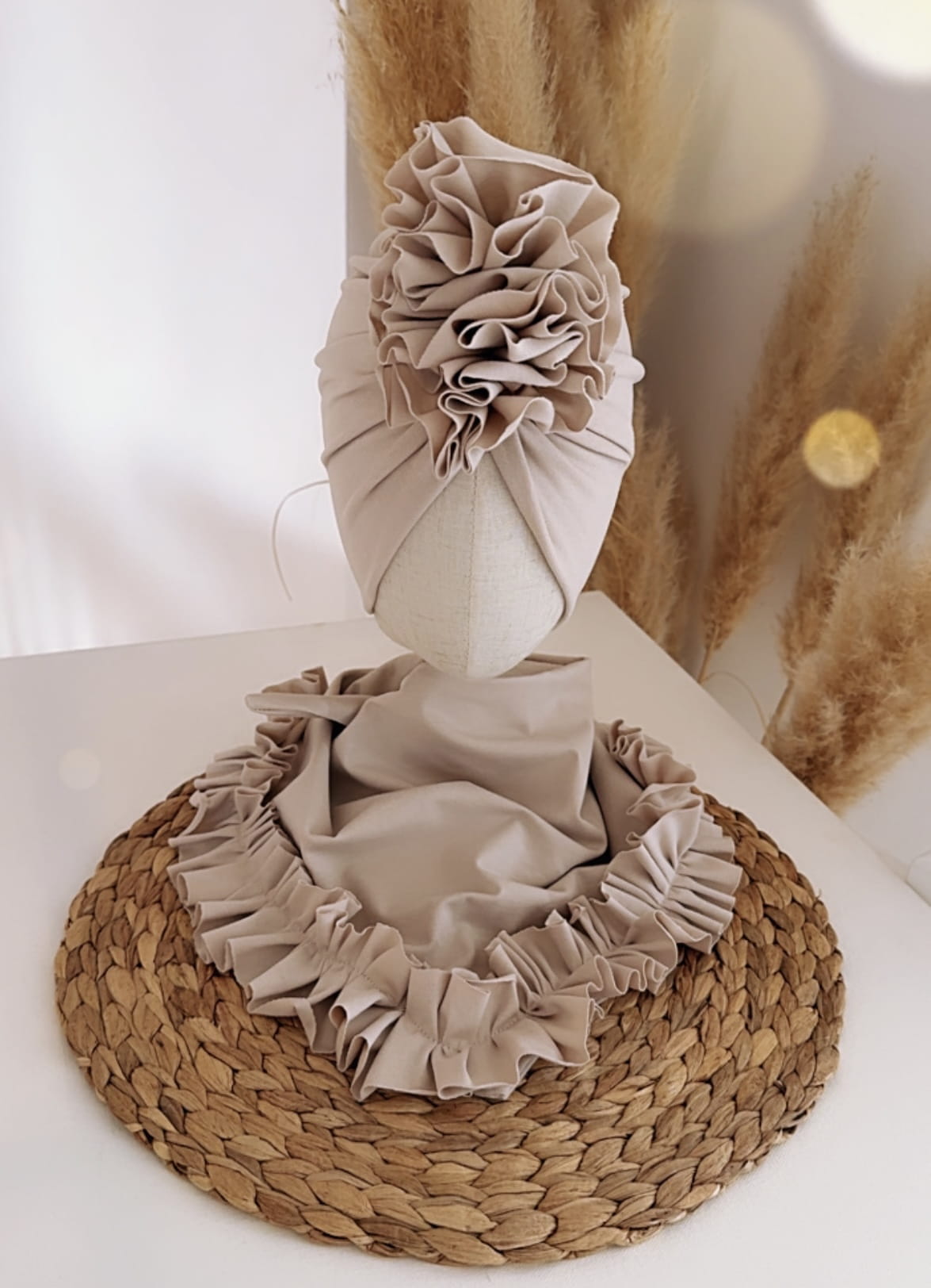 Komplet turban z falbaną i chusta z falbaną (jasny beż)