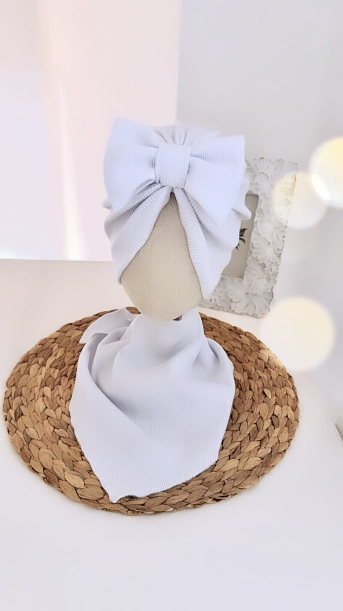Komplet turban z kokardą i chusta (biały prążek)