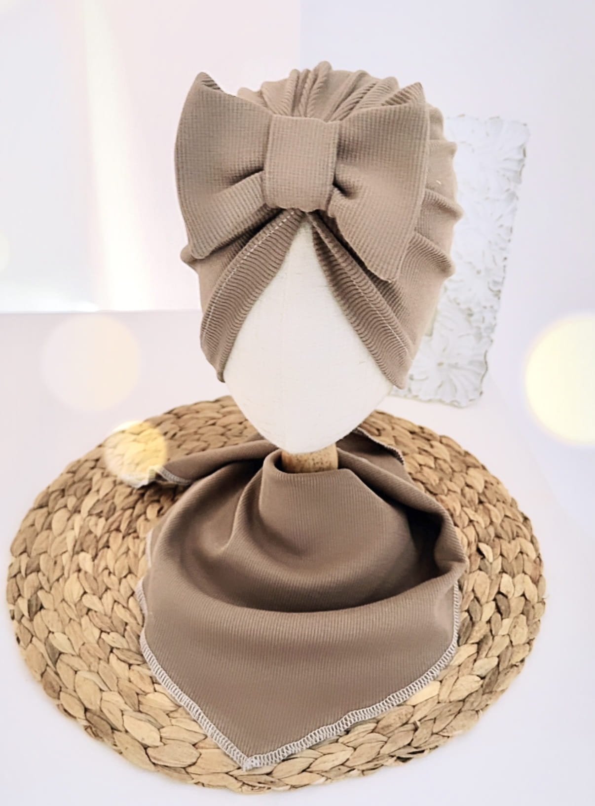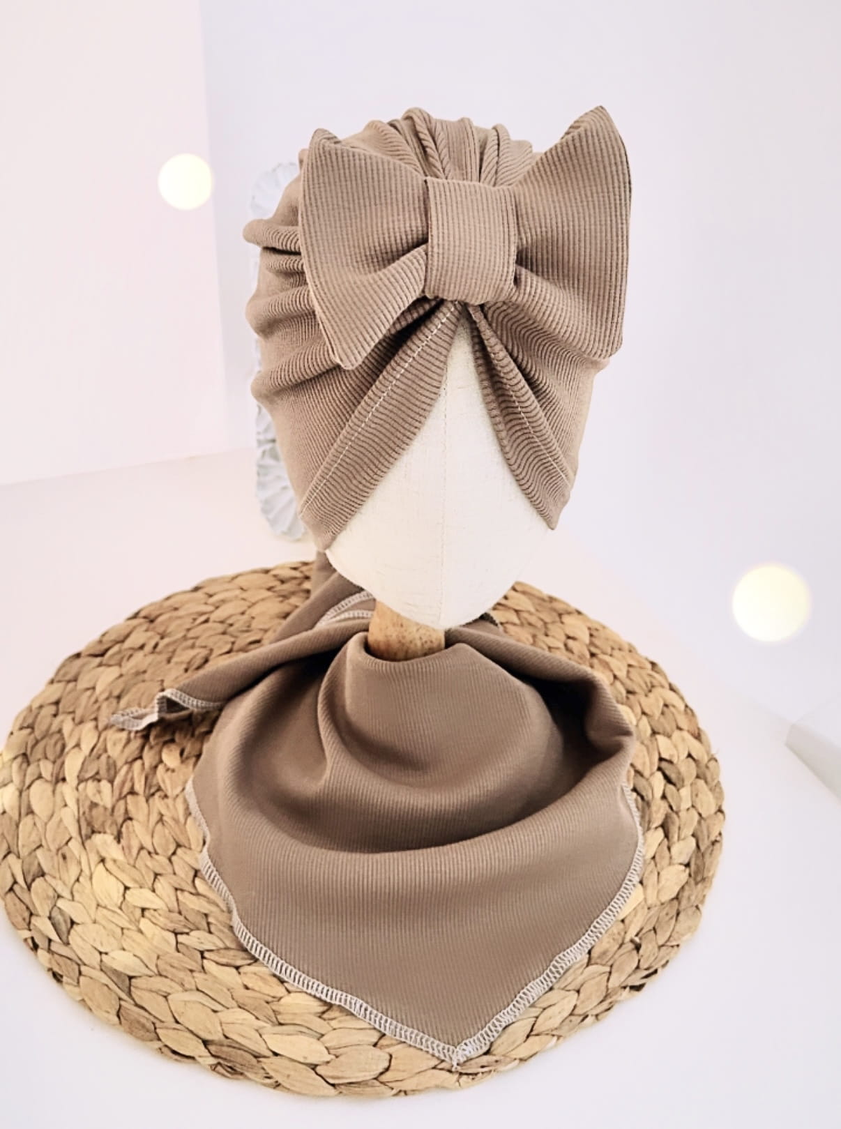 Komplet turban z kokardą i chusta (mokka prążek)