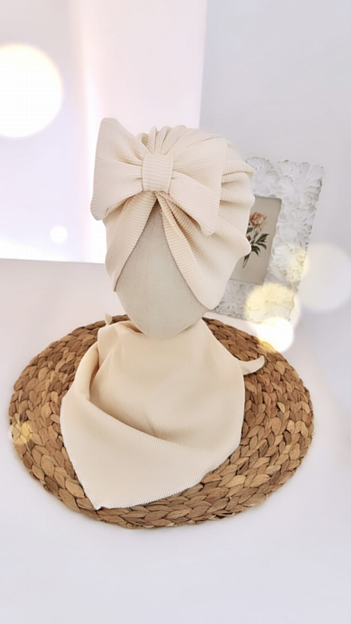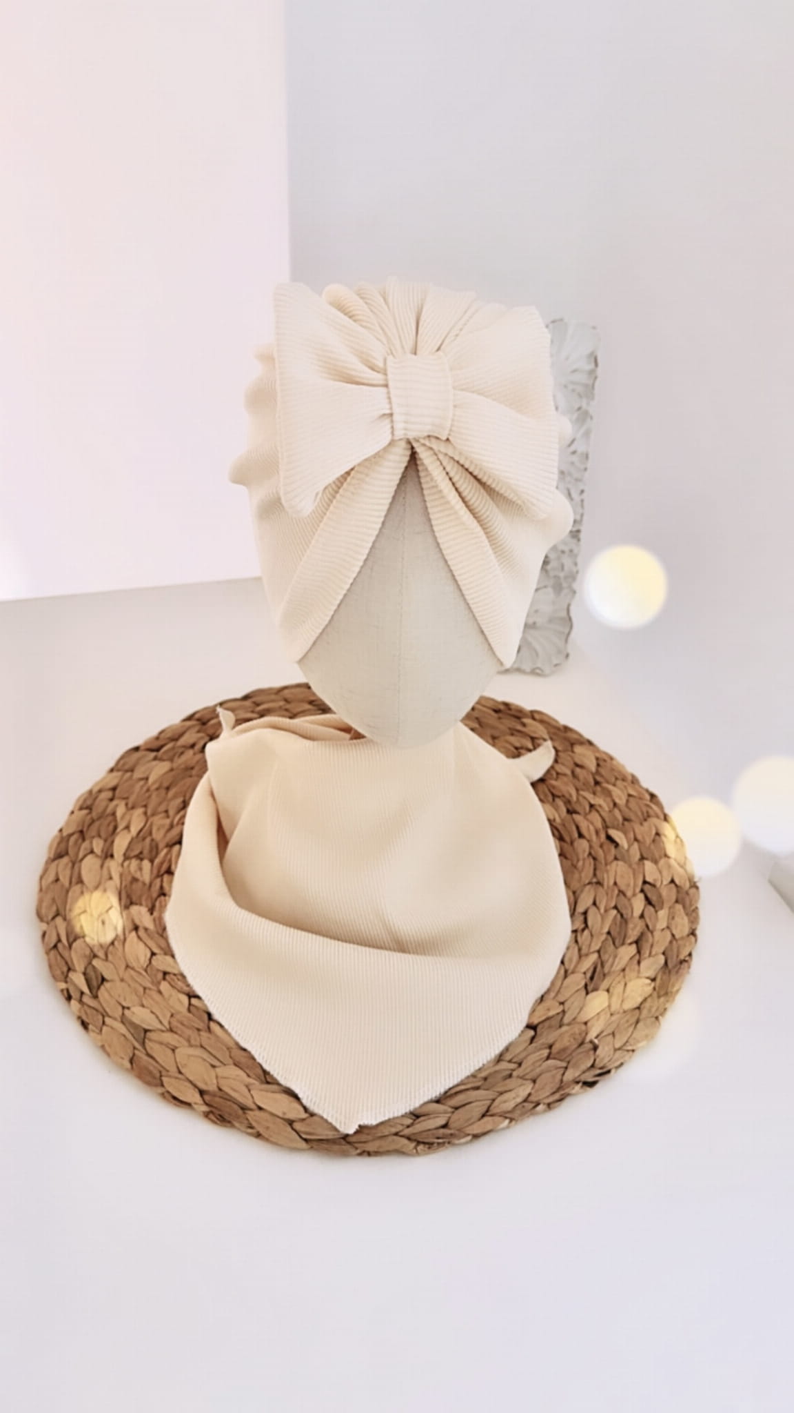 Komplet turban z kokardą i chusta (wanilia prążek)
