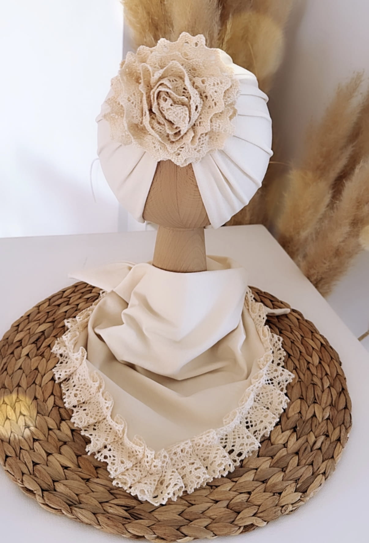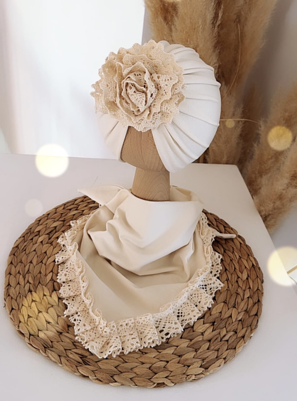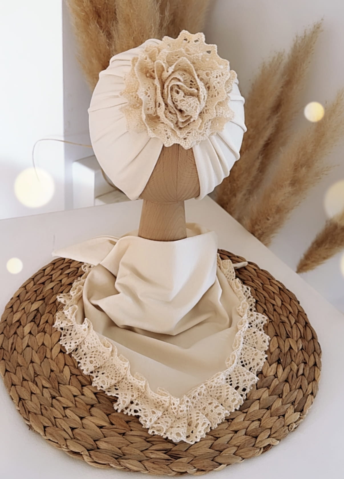 Komplet turban z koronką i chusta z koronką (wanilia)