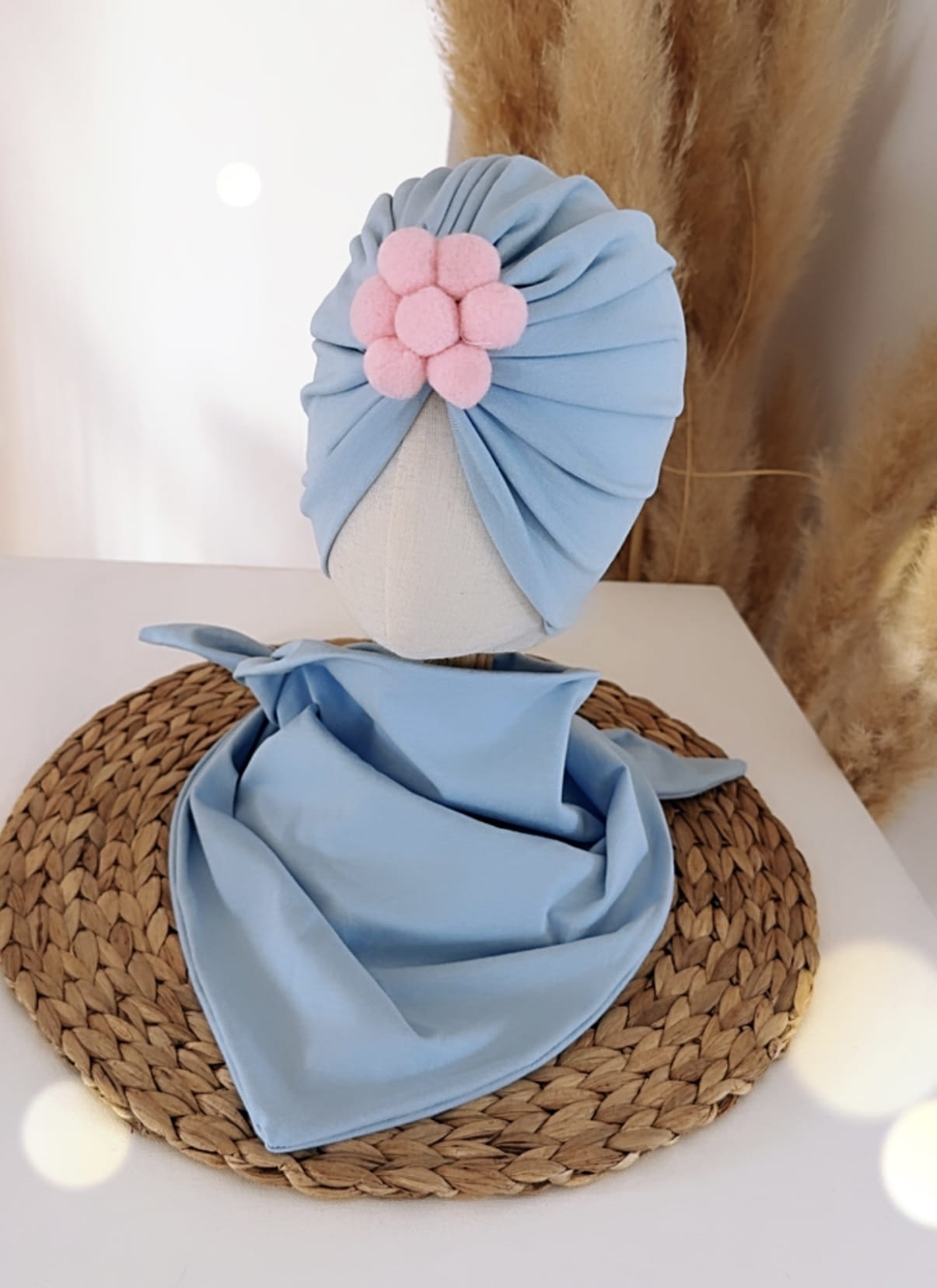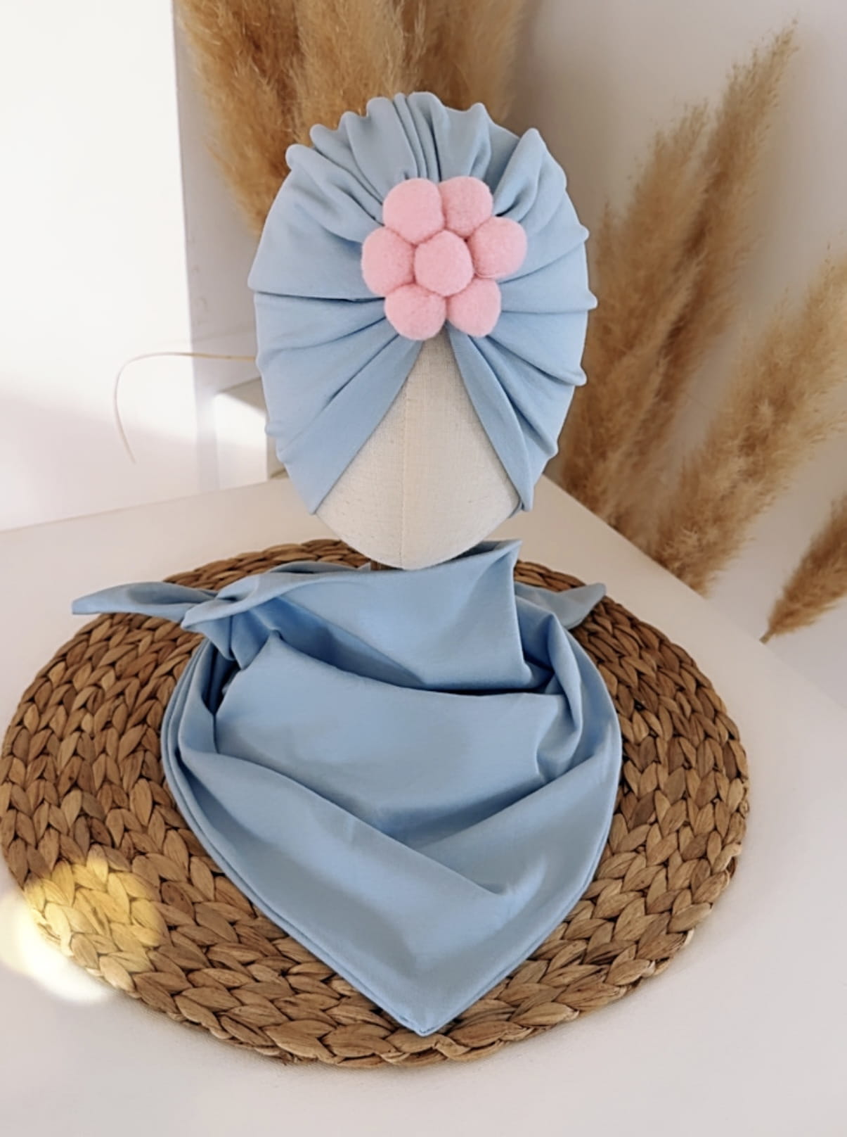 Komplet turban z kwiatuszkiem i chusta (baby blue)